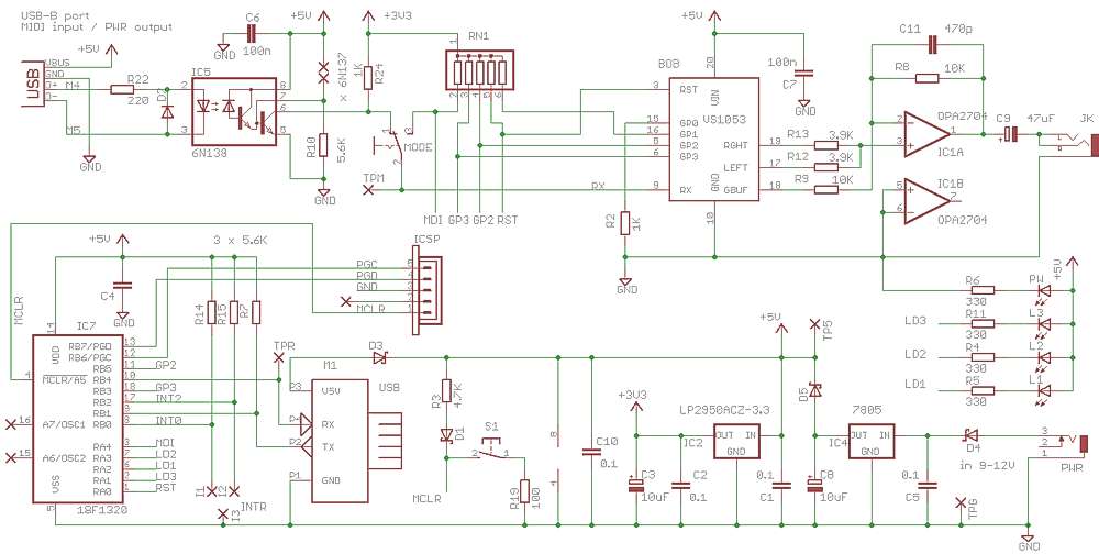 Abbiamo la classica intefaccia MIDI-IN che utilizza un optoisolatore 6N138 (o un 6N137 - per questo occorre cortocircuitare