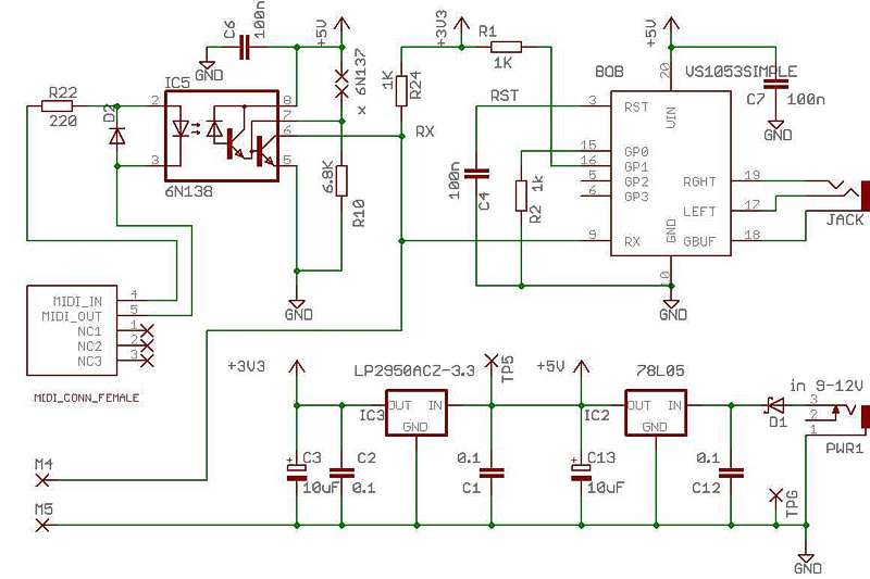 Come detto, interfacciare una porta MIDI con il chip VS1053 è molto semplice. L'immagine a fianco è lo schema