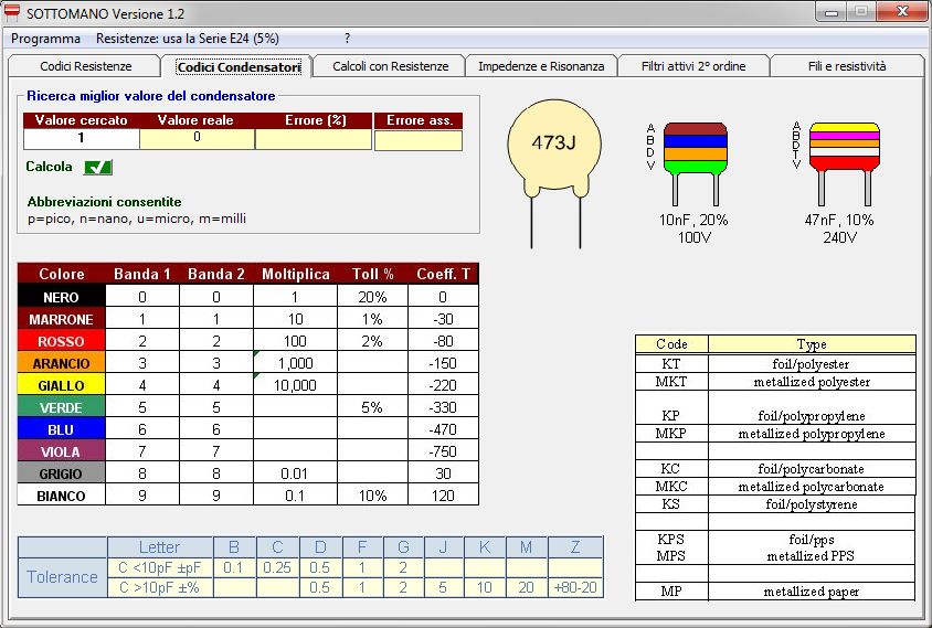 Per i condensatori è prevista un'area per la ricerca del miglior valore commerciale (nella serie comune E12) a