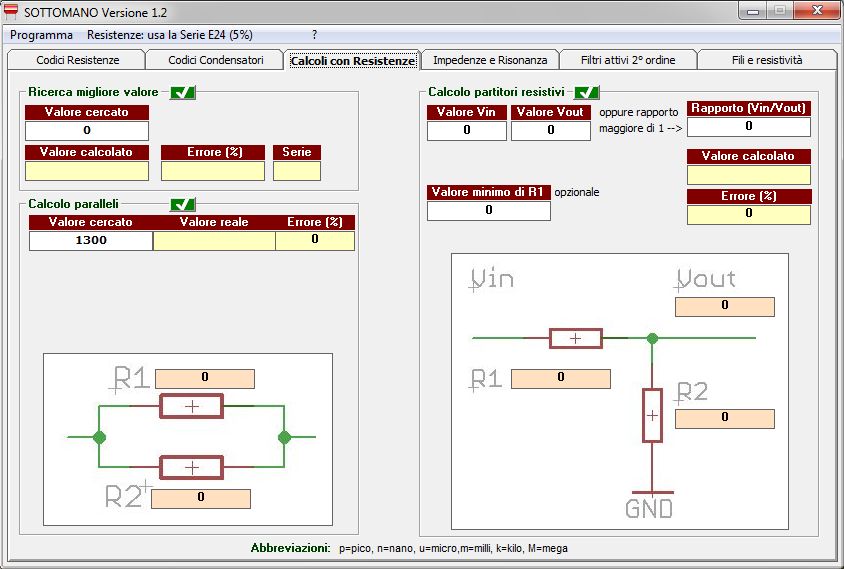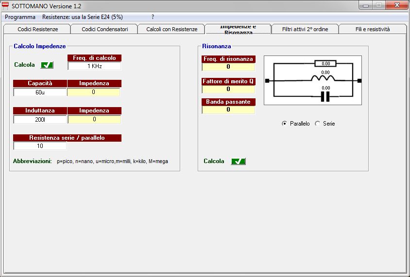 Le caselle di input per i valori di resistenza, capacità, induttanza e frequenza, prevedono di norma