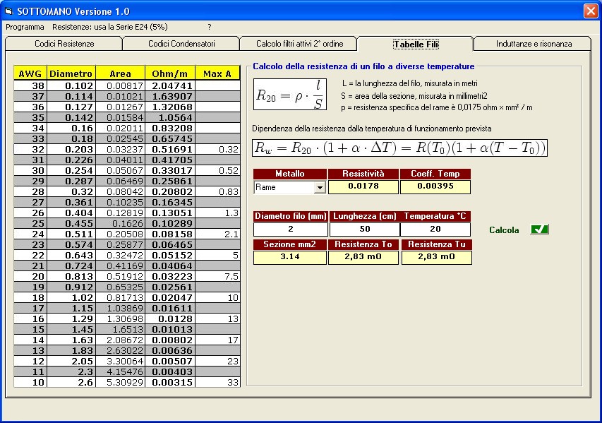 Sulla destra, si può calcolare la resistenza di un filo metallico (in diversi materiali più o meno comuni) alla